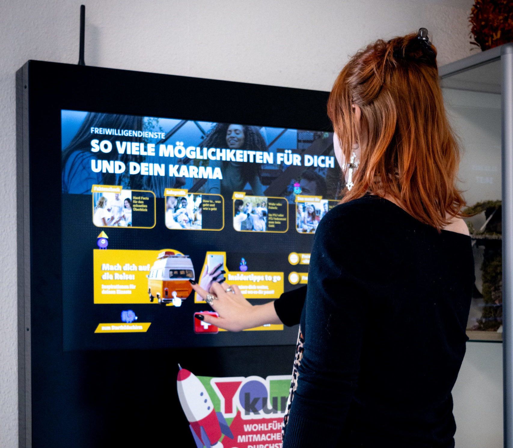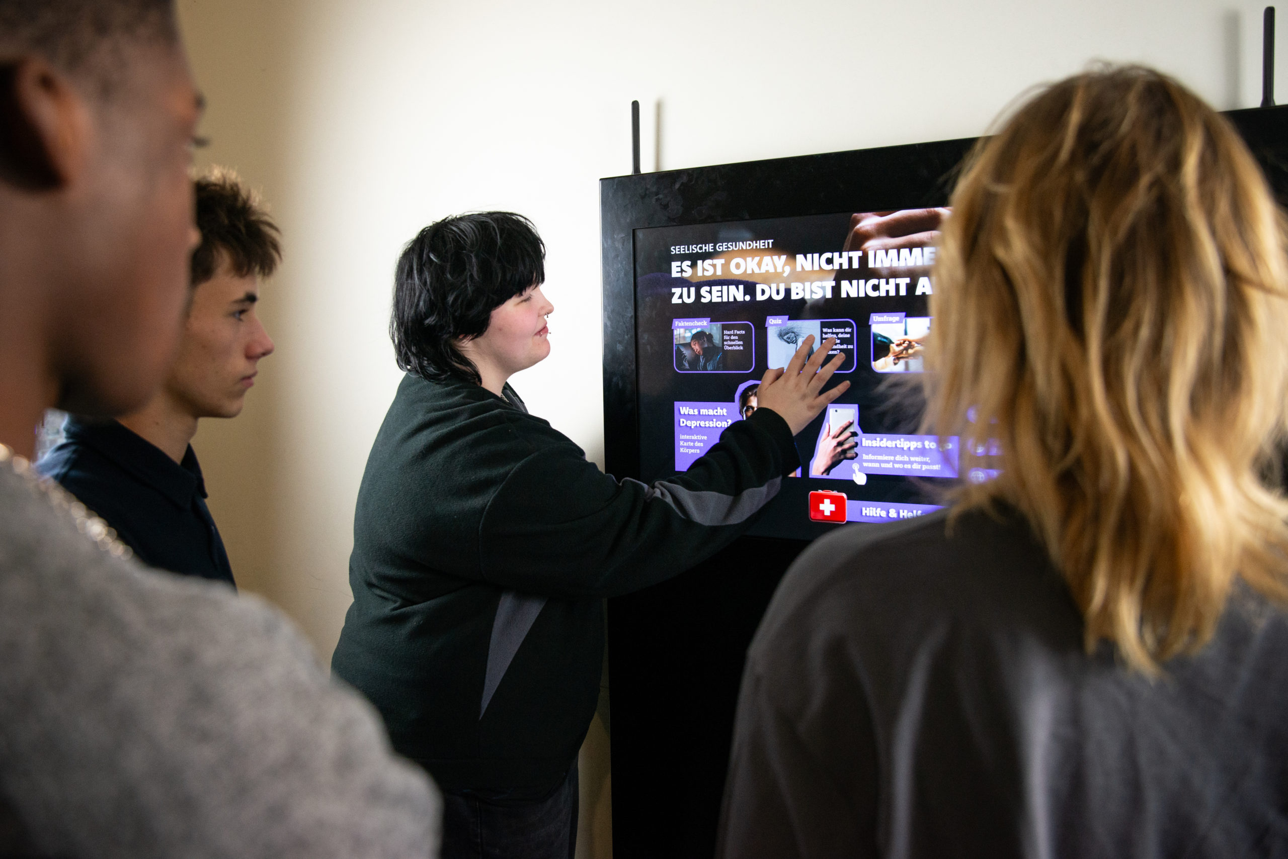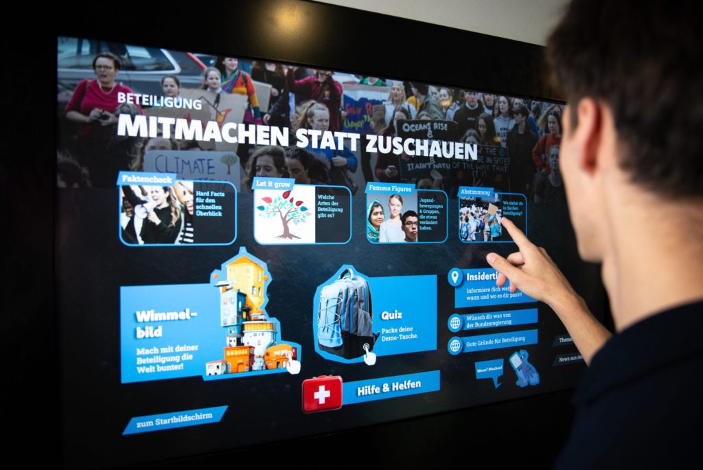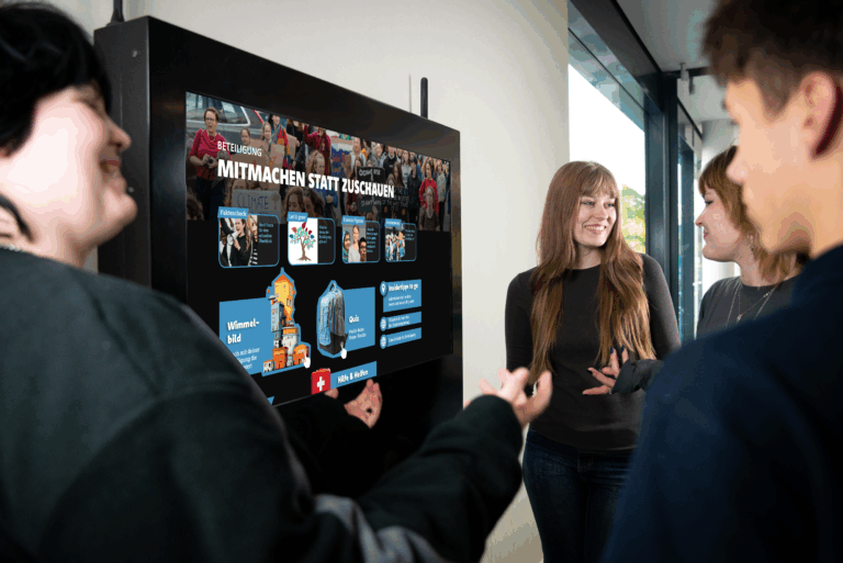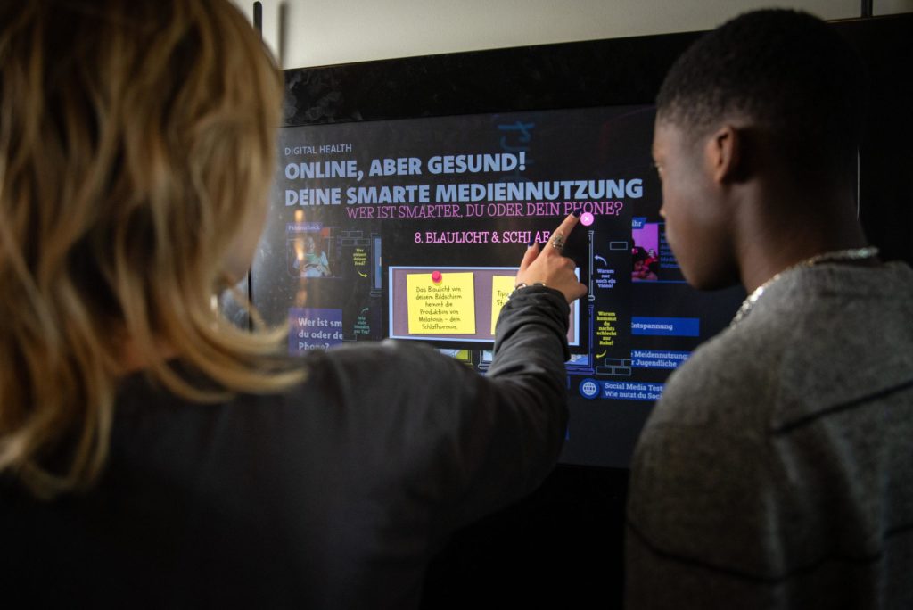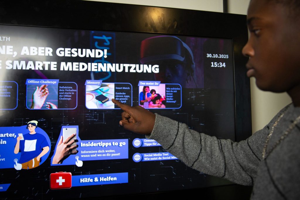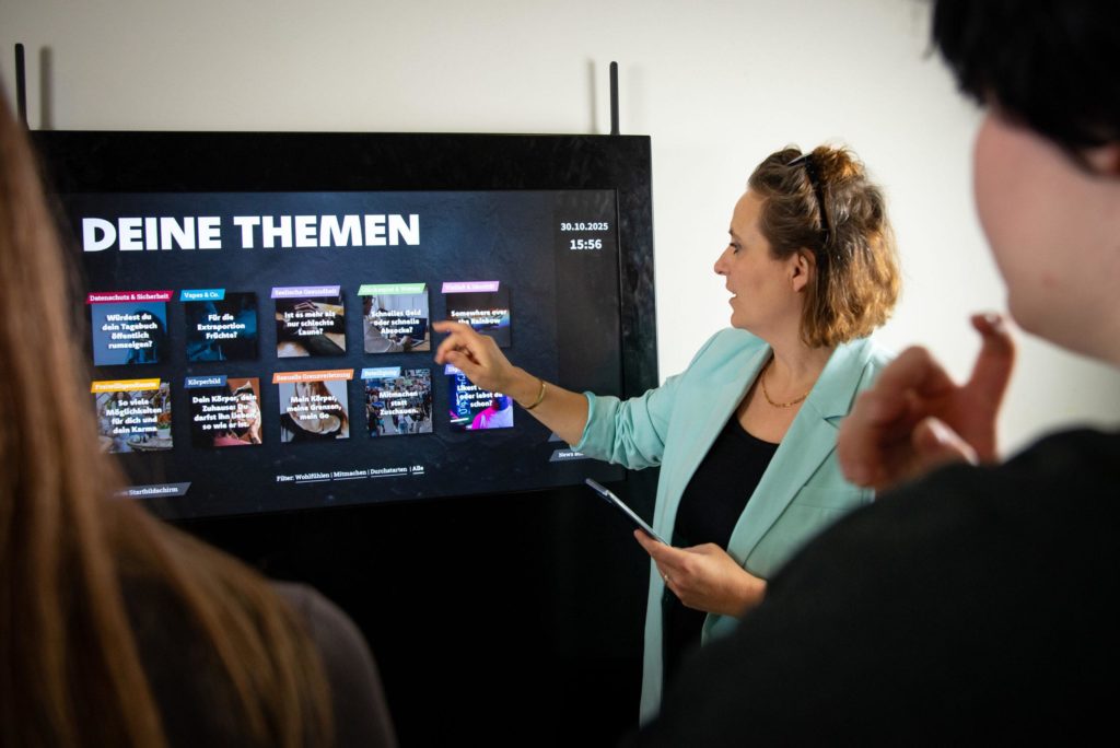 An einem 43-Zoll-Touchscreen-Monitor können sich Jugendliche in der Schule direkt über rund 40 spannende Zukunftsthemen informieren. Die Inhalte sind zeitgemäß aufbereitet, interaktiv gestaltet und überzeugen mit qualitätsgeprüften Inhalten.