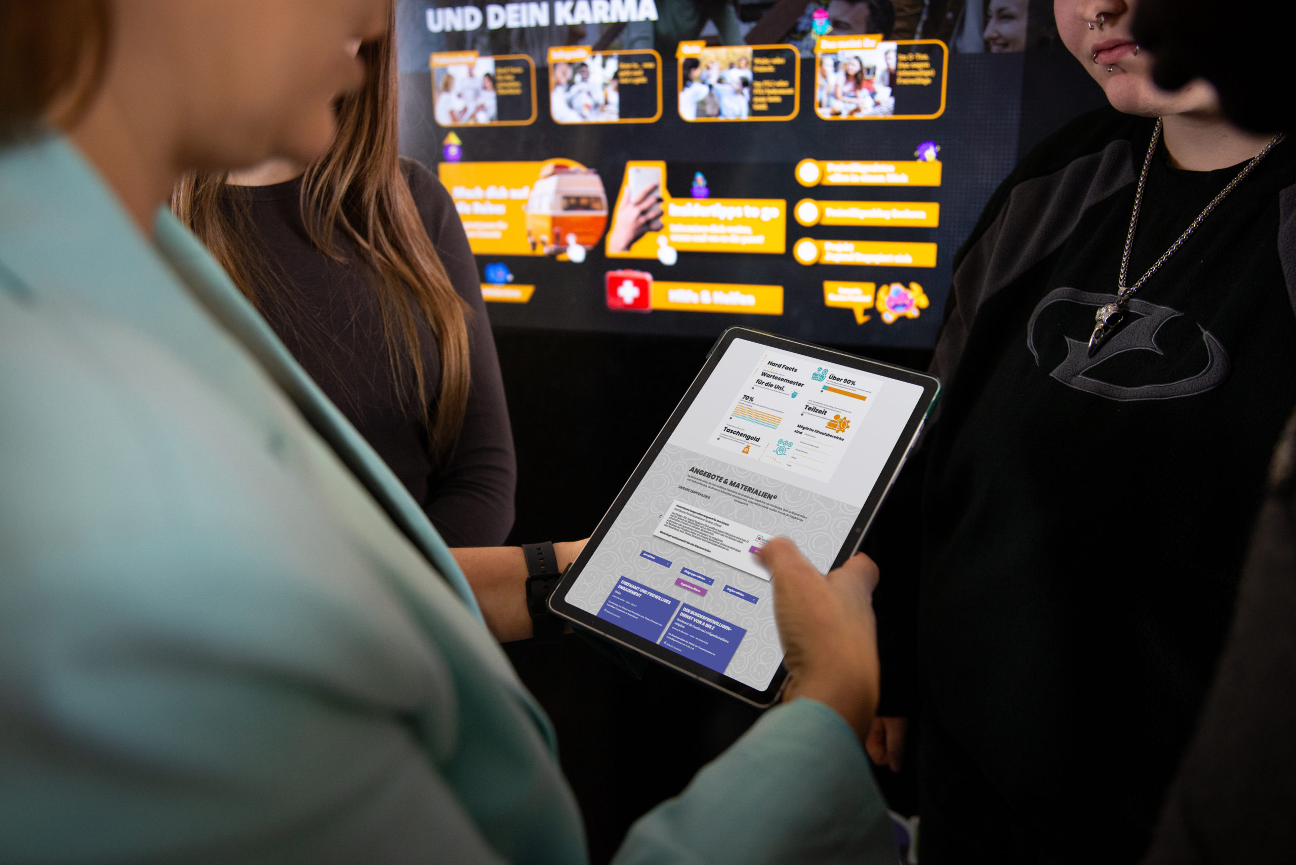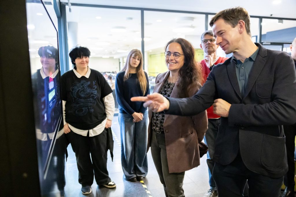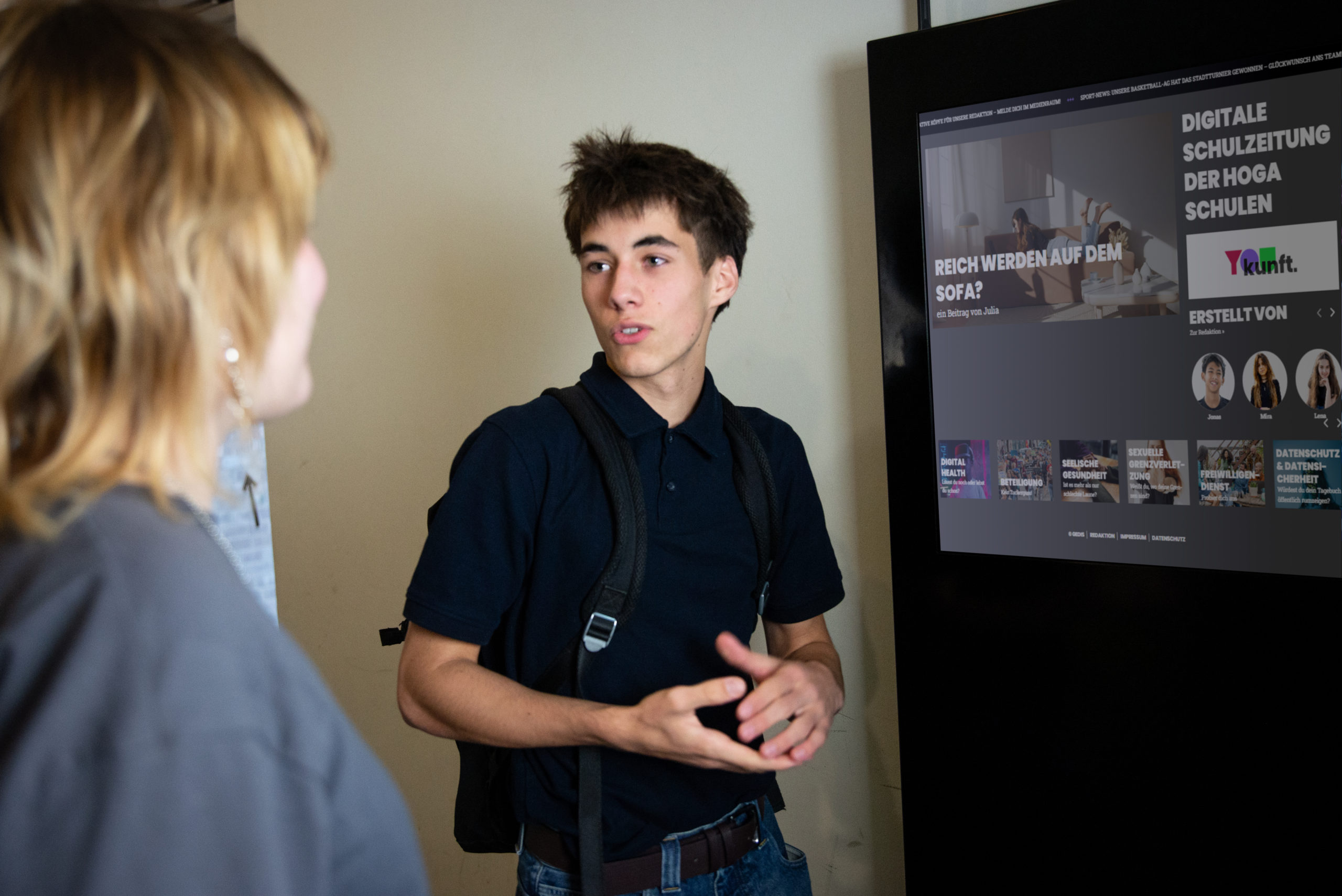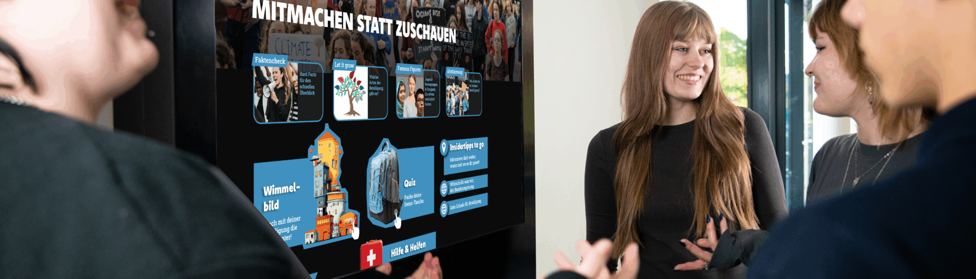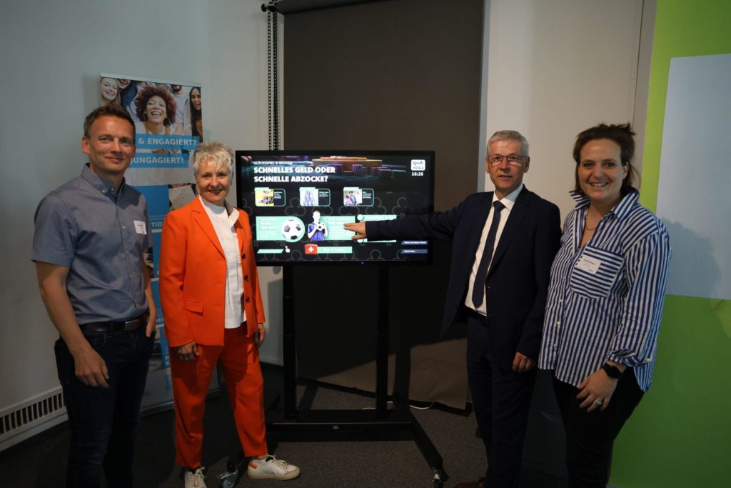 An einem 43-Zoll-Touchscreen-Monitor können sich Jugendliche in der Schule direkt über rund 40 spannende Zukunftsthemen informieren. Die Inhalte sind zeitgemäß aufbereitet, interaktiv gestaltet und überzeugen mit qualitätsgeprüften Inhalten.
